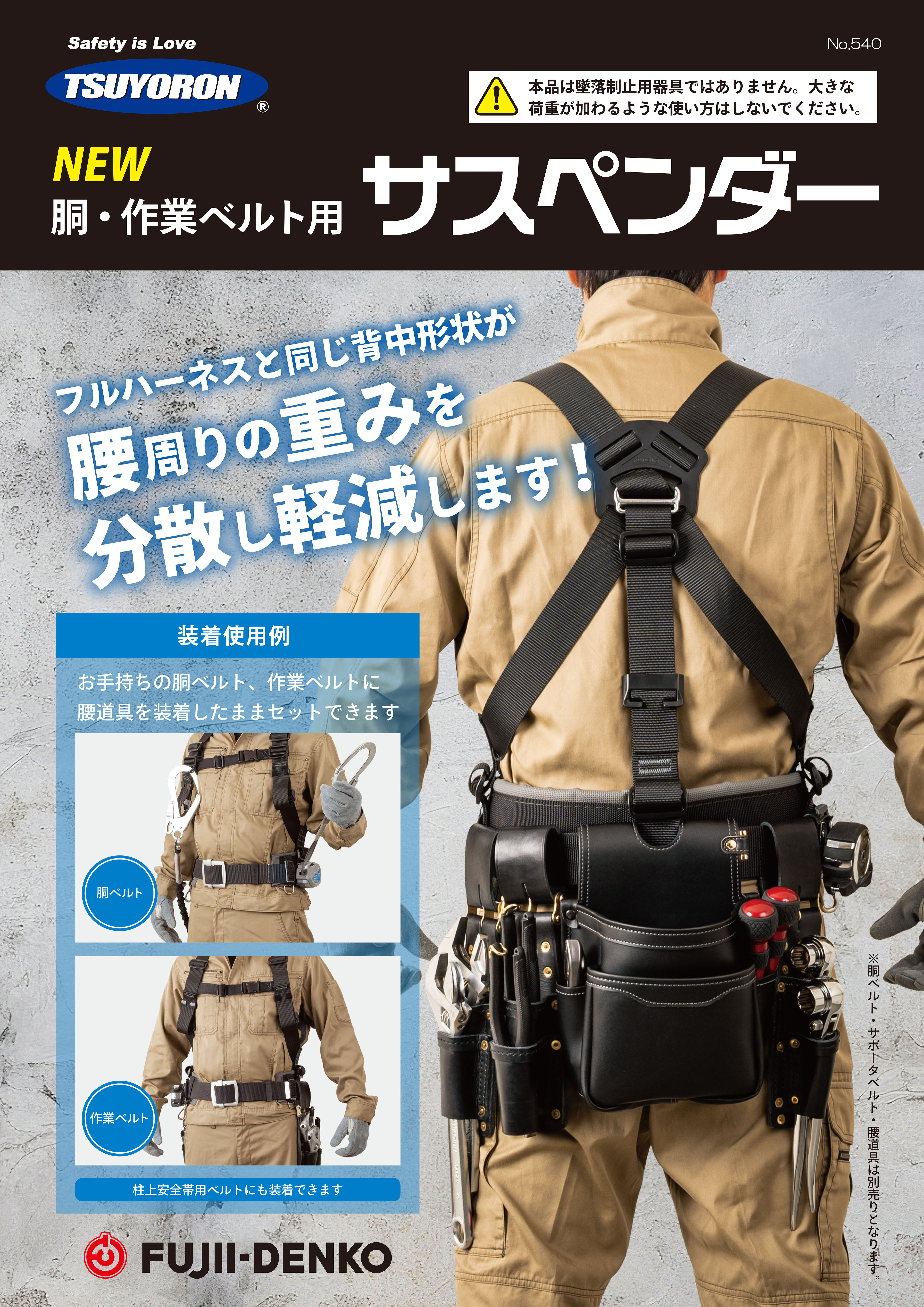 「胴・作業ベルト用サスペンダー」発売案内 2026.02.02 新製品「胴・作業ベルト用サスペンダー」を発売いたします。 墜落制止用器具の胴ベルト型や腰道具の装着を目的とした作業ベルトと組み合わせた使用において、 腰周りの重さを両肩に分散し、負担を軽減する製品となっております。 製品についての詳細は、カタログをご覧ください。 2026年2月2日より販売開始 カタログダウンロードはこちら↓ また、使用条件など詳しいことは取扱説明書をご覧ください。 取扱説明書はこちら↓